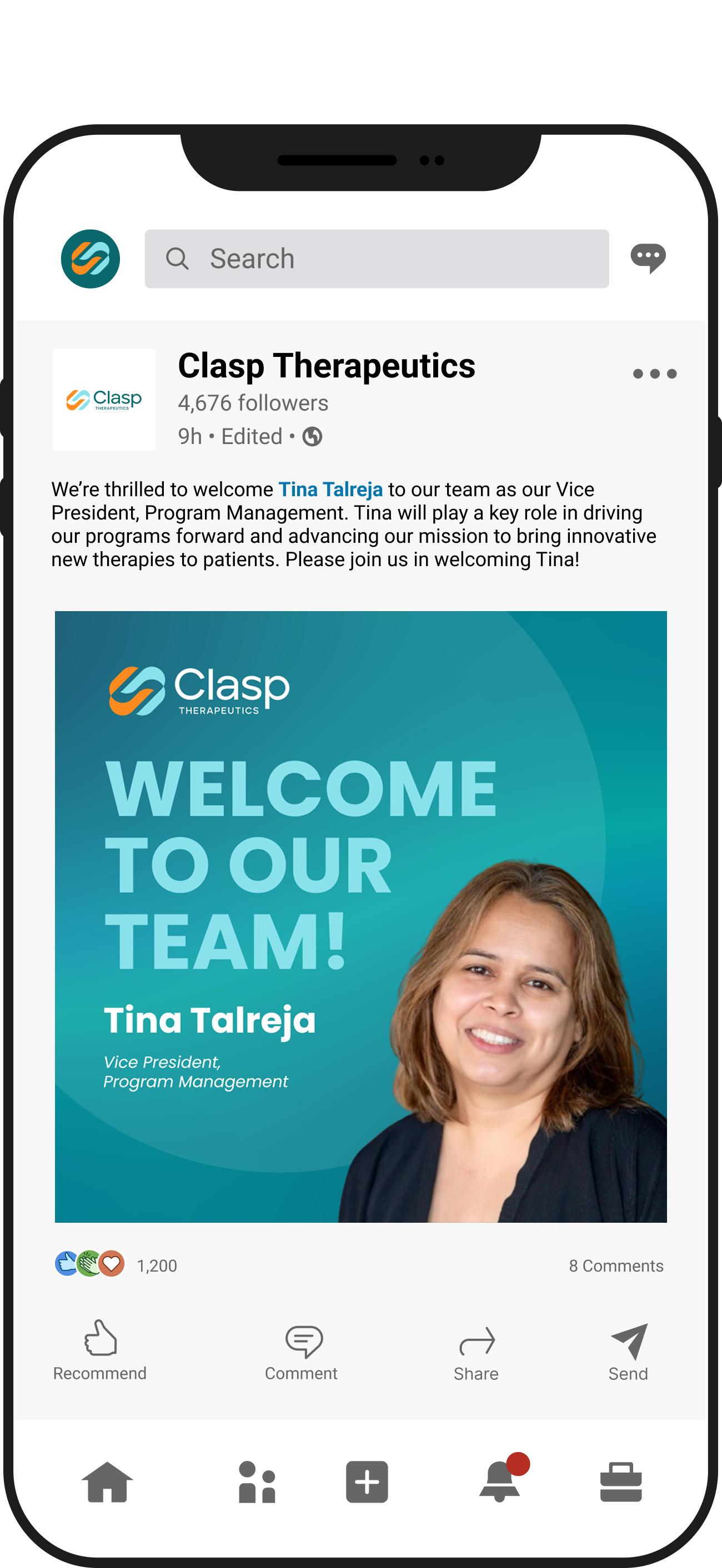 Clasp Therapeutics required a series of engaging social media campaign visuals to spotlight new hires, celebrate employee achievements, and highlight company initiatives. This campaign boosted engagement across platforms, showcased their innovative culture, and reinforced their position as a leader in the biotech industry.
